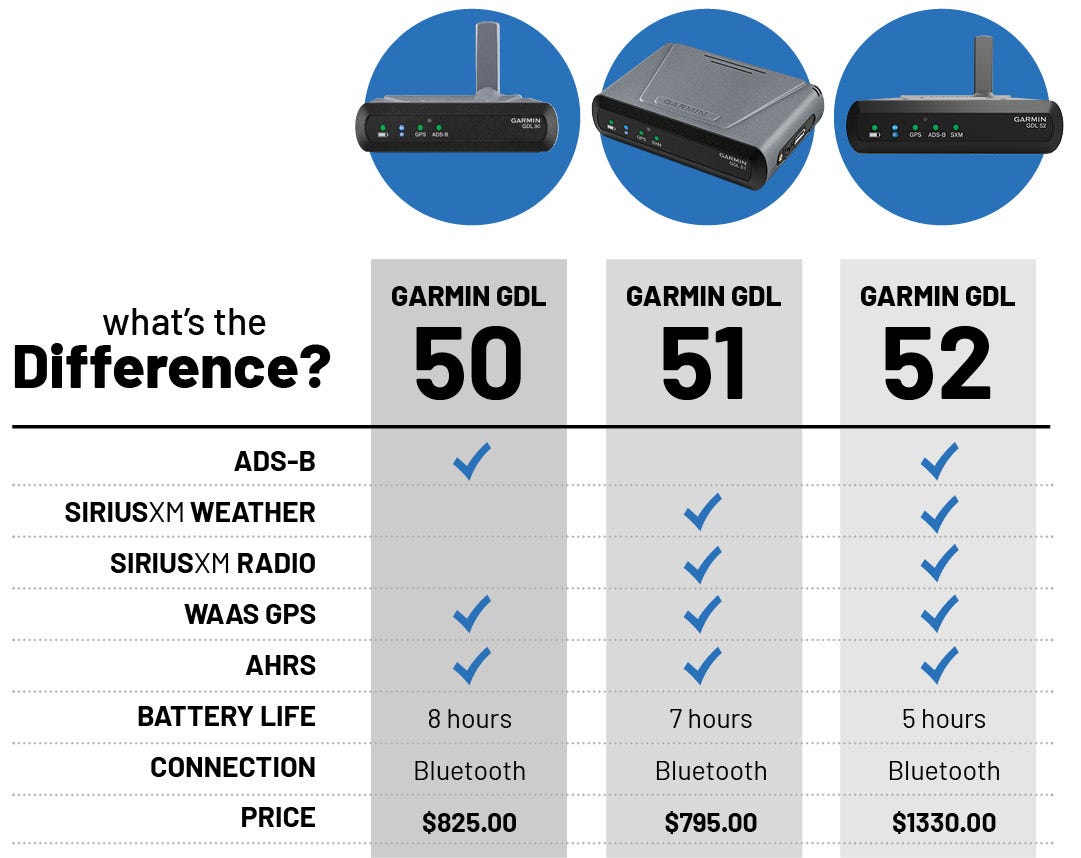 Subscription required for weather and audio. Subscriptions start at $29.99/mo. Note: pilots using Garmin Pilot have three subscription tiers to choose from; pilots using ForeFlight Mobile with the Garmin GDL 51 can access two tiers of SiriusXM Aviation weather (Pilot for ForeFlight or Pilot Express). Click here to learn more.