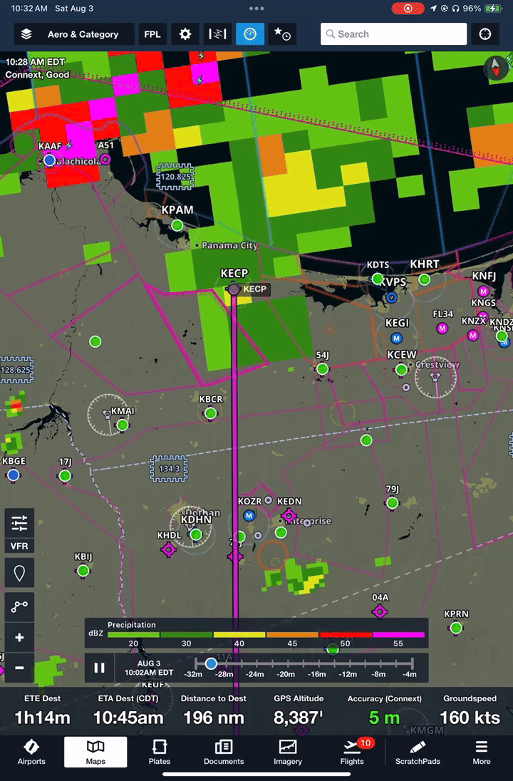 On a recent flight from Cincinnati to Panama City, FL, however, leaving early wouldn’t guarantee a storm-free flight. While most of the 528 NM flight would consist of nothing more than a few stratus or cumulus clouds, there was an active weather system with lots of convection and heavy rainfall churning on all sides of the destination. Here’s what that looked like at 8 AM: