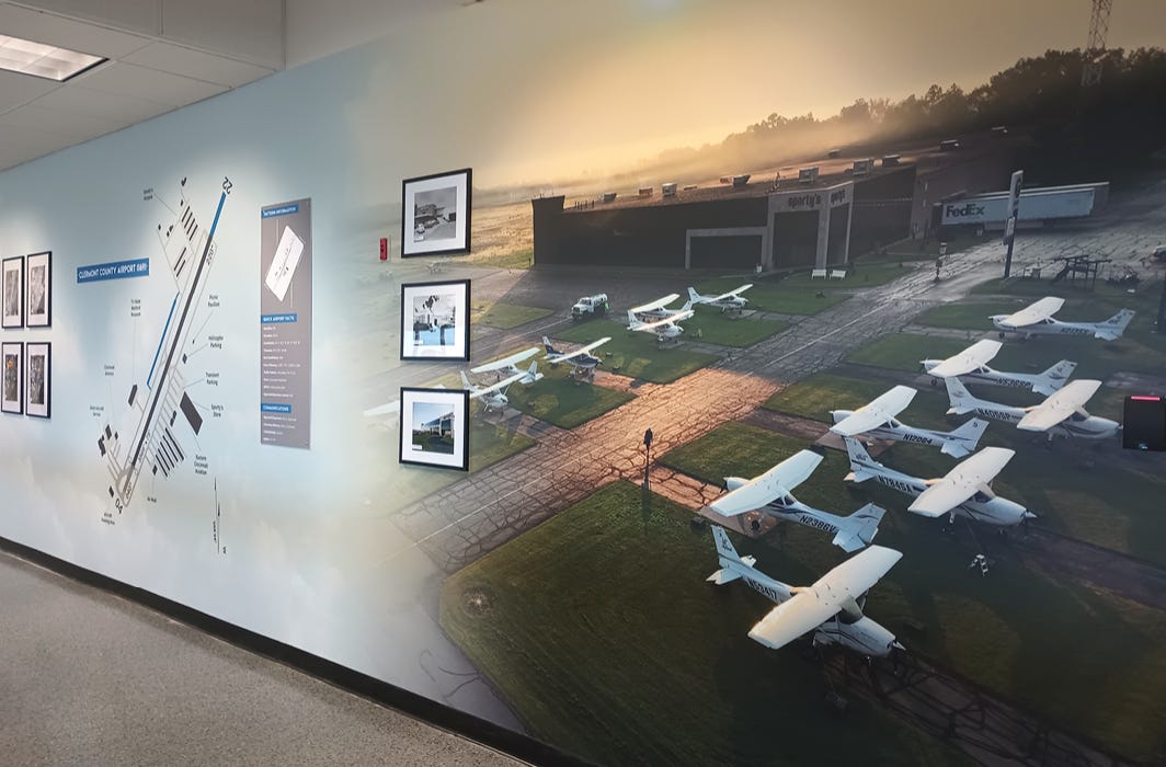 If you visit on a Saturday, you can enjoy our famous weekly cookout. Every Saturday between noon and 2pm, we grill hot dogs, metts, and brats in appreciation of our customers. Meet a new friend around our charcoal grill and share some flying stories. While you're here, browse our lobby, which includes a Cessna 150 opened up, a jet engine, and our timeline wall that shows the 60-year history of Sporty's.